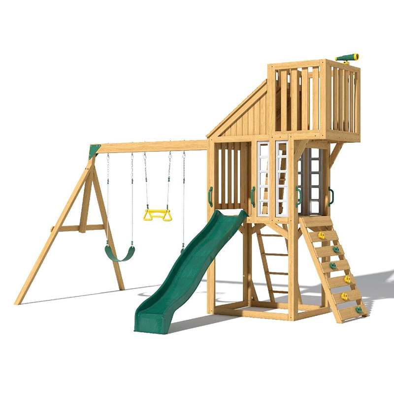 Play elevato: grande club house con tetto in legno e finestre a basso.