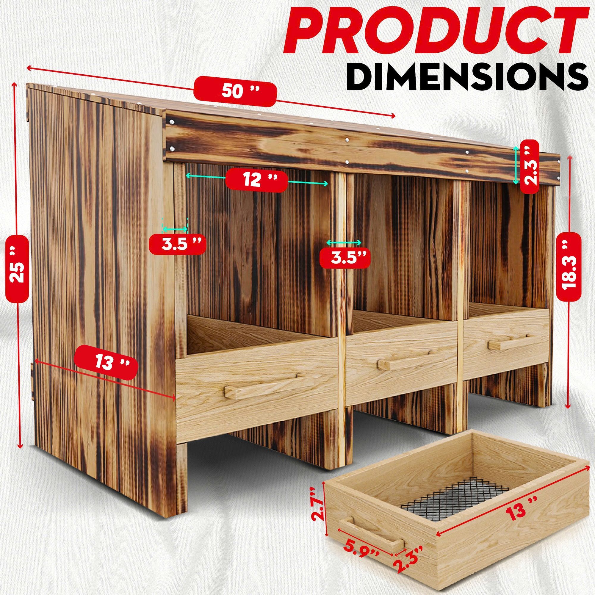 Il telaio in legno massimo e lo spessore della tavola da 1,5 cm assicurano una struttura robusta e duratura. La FIR è un legno tenero di alta qualità ampiamente utilizzato nella costruzione esterna per la sua resistenza naturale e il grano dritto. Per migliorare la durata, ogni pannello di legno viene prima carbonizzato (a carrello profondo) in un processo tradizionale. Questo carbonizzazione profonda compatta le cellule superficiali del legno, proteggendo dall'umidità e danni ai raggi UV. Infine, una vernice ecologica a base d'acqua viene applicata come sigillante. Questa finitura resistente all'acqua aggiunge un ulteriore strato di protezione contro la pioggia e il tempo, preservando l'aspetto della coop e estendendo la sua durata della vita.